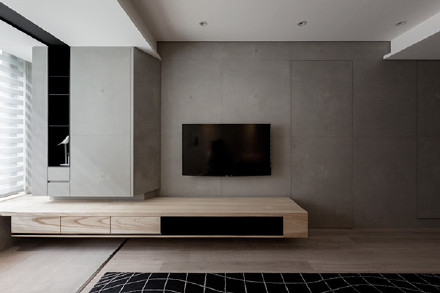 这套案例中的应用就不错,用混凝土板打造了整个电视背景墙。餐厅和厨房之间的移门也设置也很赞,移门关闭时隔绝油烟,打开时又能成为开放式餐厨一体。